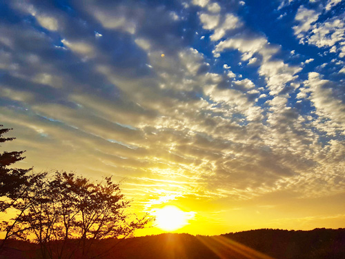 写真ではわかりづらいですが、夕陽が紅葉の山々を
