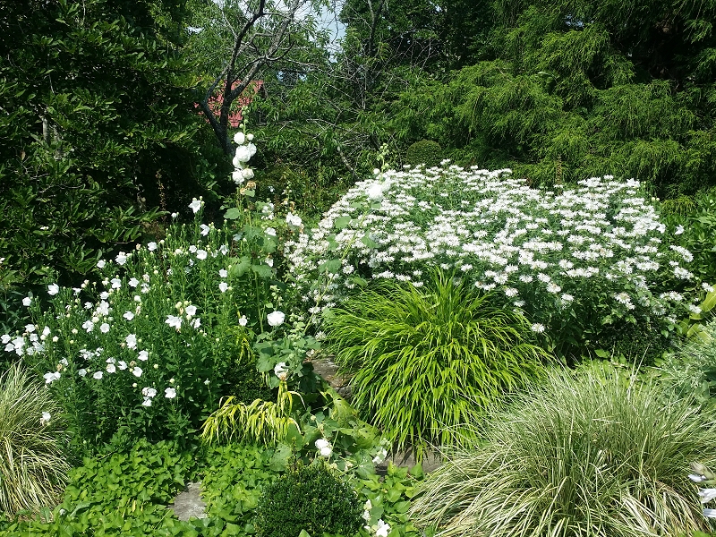 ホワイトガーデンの花たち(キキョウ、エキナセア、ホリーホック)