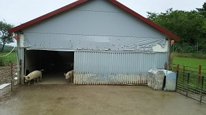放牧豚は屋根と餌場がある家から放牧できるように飼育されています。