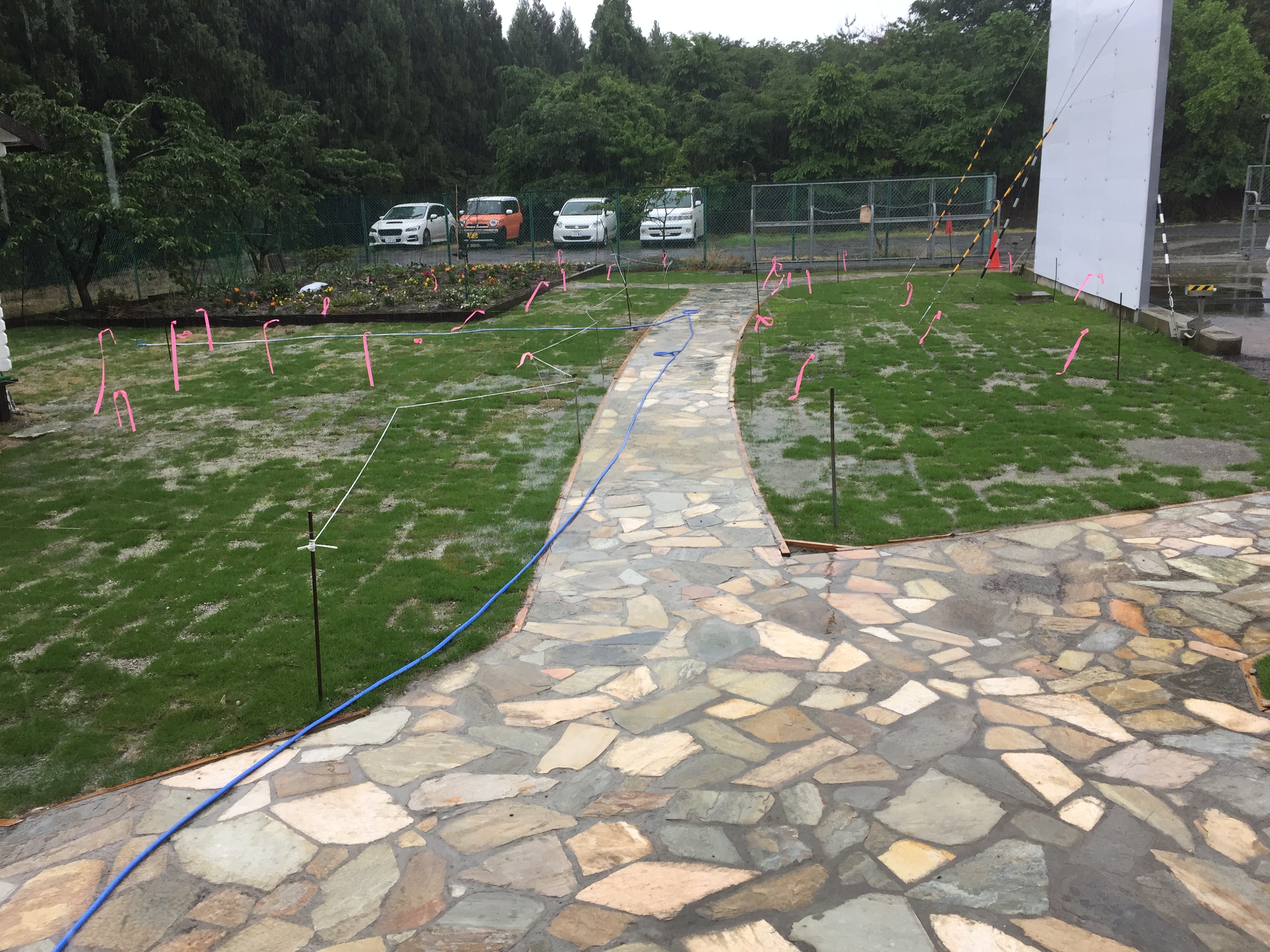 歩く所は石畳みをひき芝生も植えやっと緑になってきました。来場者の方々に気持ち良く来場してもらうために綺麗に維持管理していきたいと思います。