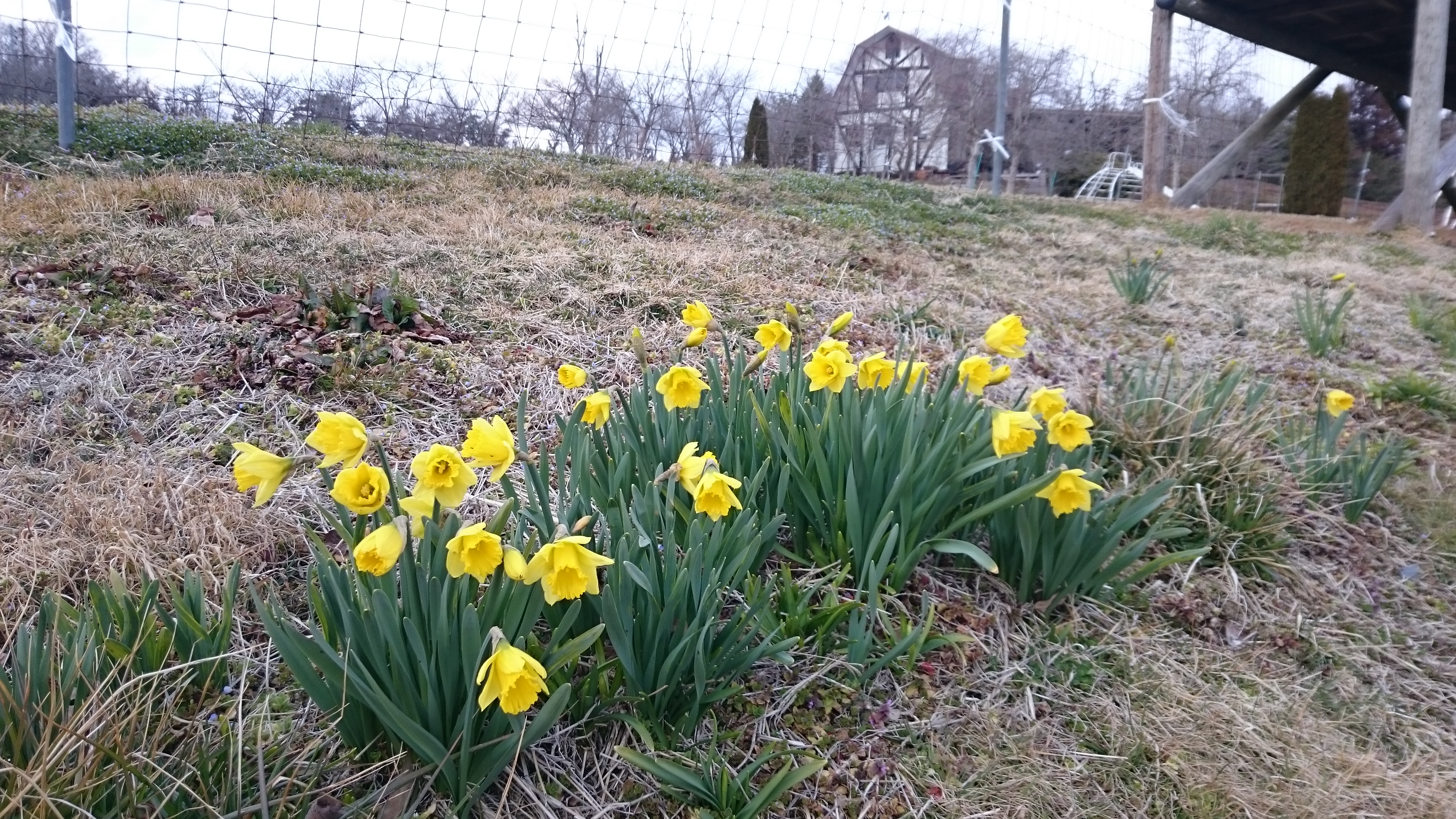 虹の丘ガーデンには水仙がオオイヌノフグリの中に咲き、紅梅も花開き芳香を放っています。