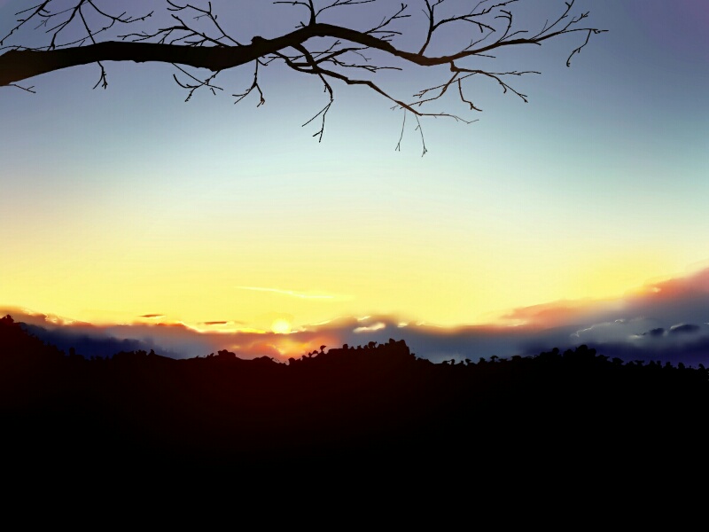 上の絵は、ツリーハウス前から観た夕焼けを描いてみました。