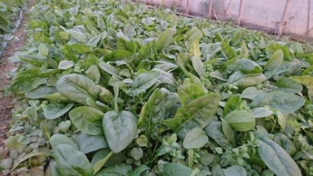 ↑寒さを全身に浴びて太い茎に茎・甘いホウレンソウ。牧場ではサラダホウレンソウとアトラスの2種類を栽培しています。
