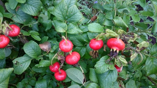 ローズヒップ(バラの実)が、真っ赤に色付いてきました。