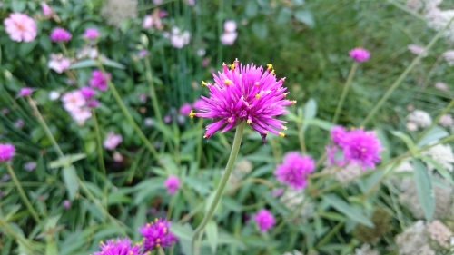 鮮やかなホットピンクで、めずらしい咲き方のセンニチコウです。