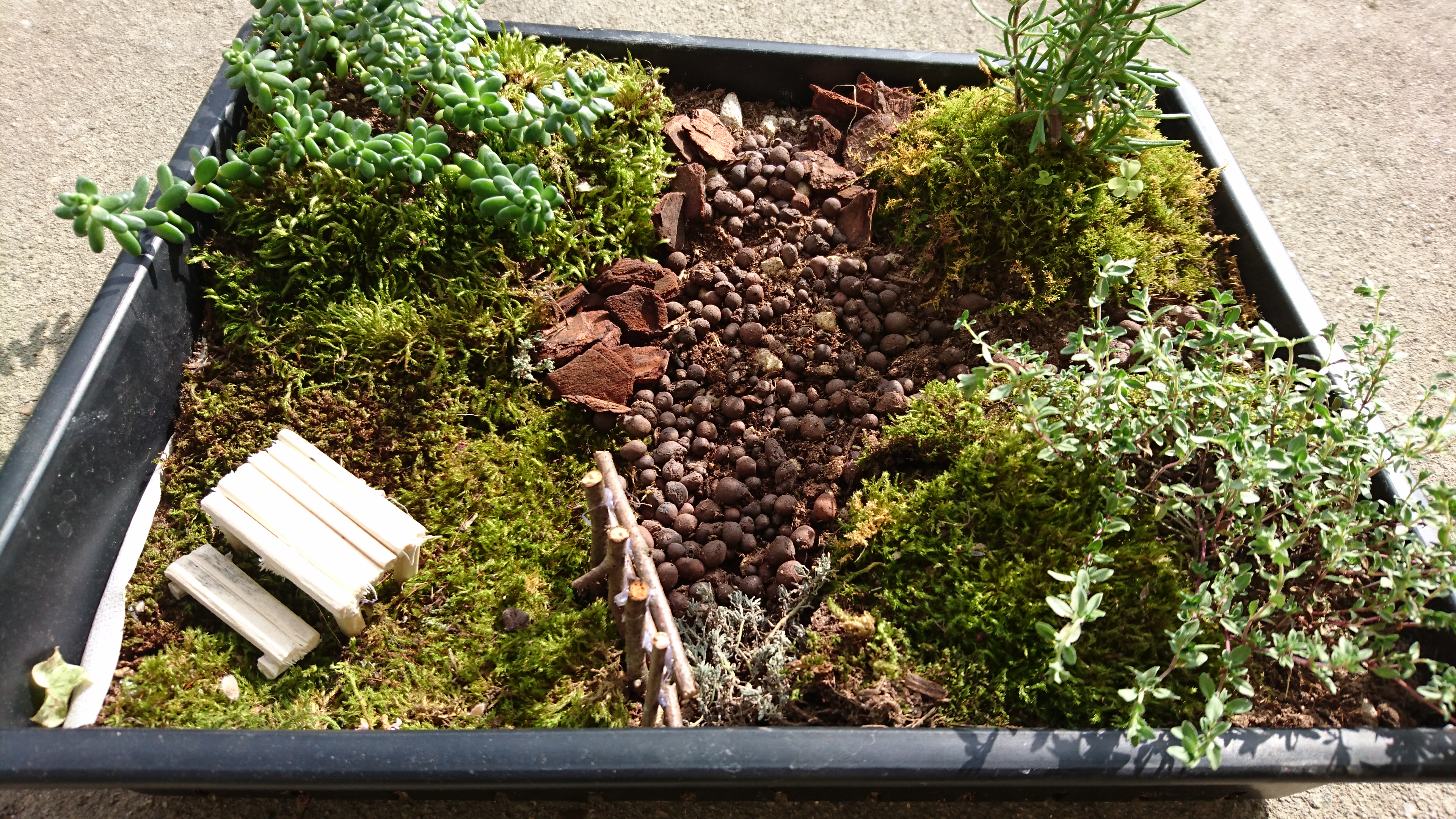 小さな あまり深くない箱に 植物や コケを植え込み 小枝やワイヤーなどで 小物を作って 理想のお庭を 作っていきます。