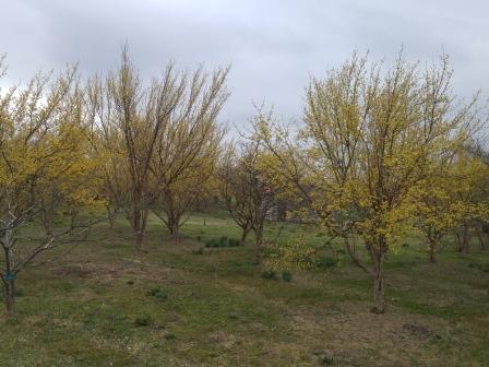 旧卵広い牧場の敷地内に咲いているサンシュユの木