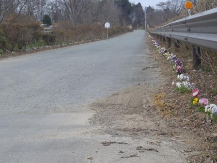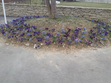 正門から料金所までの直線道路沿いと、エントランス周辺の花壇にはパンジーとビオラが植栽されています。