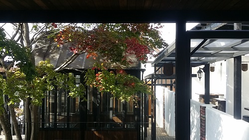 葉が赤くなり始めたモミジの奥にあるのがガラスに囲われた席です