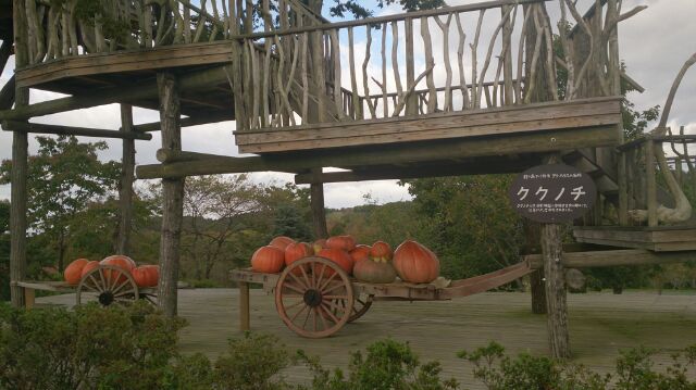 正面入口を入ってツリーハウスの下に荷車の上に、これはアーク牧場で育てたかぼちゃです。