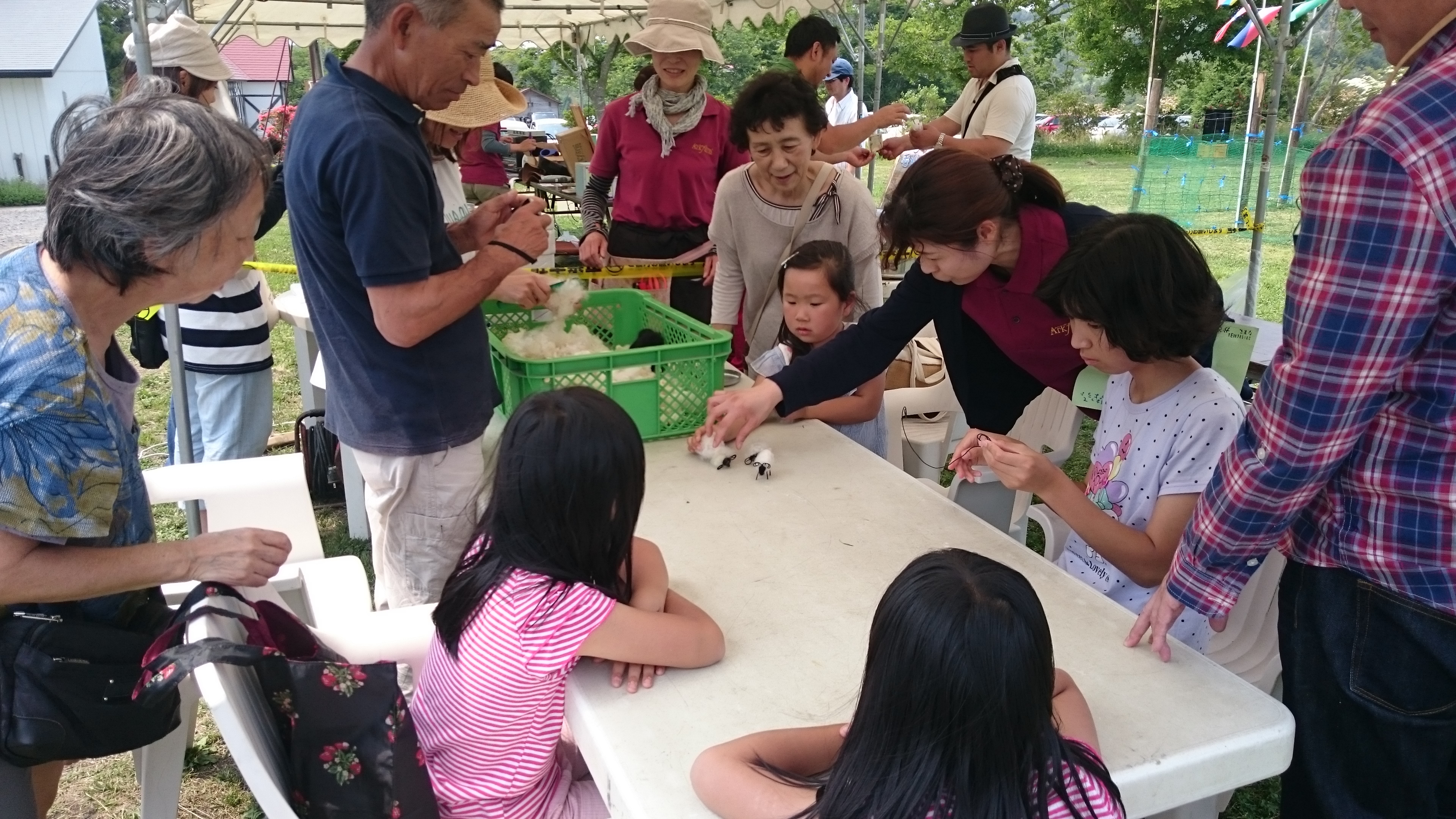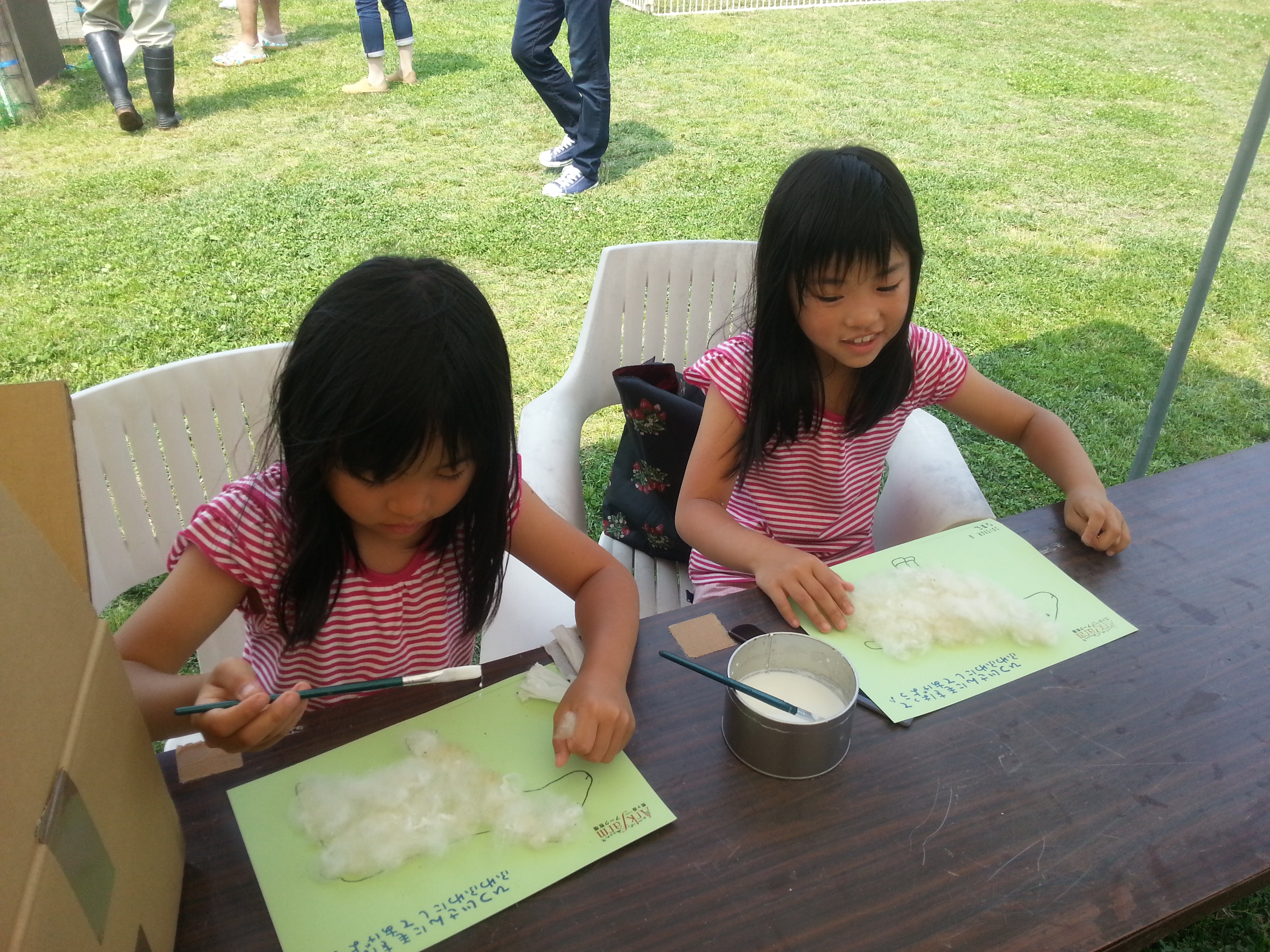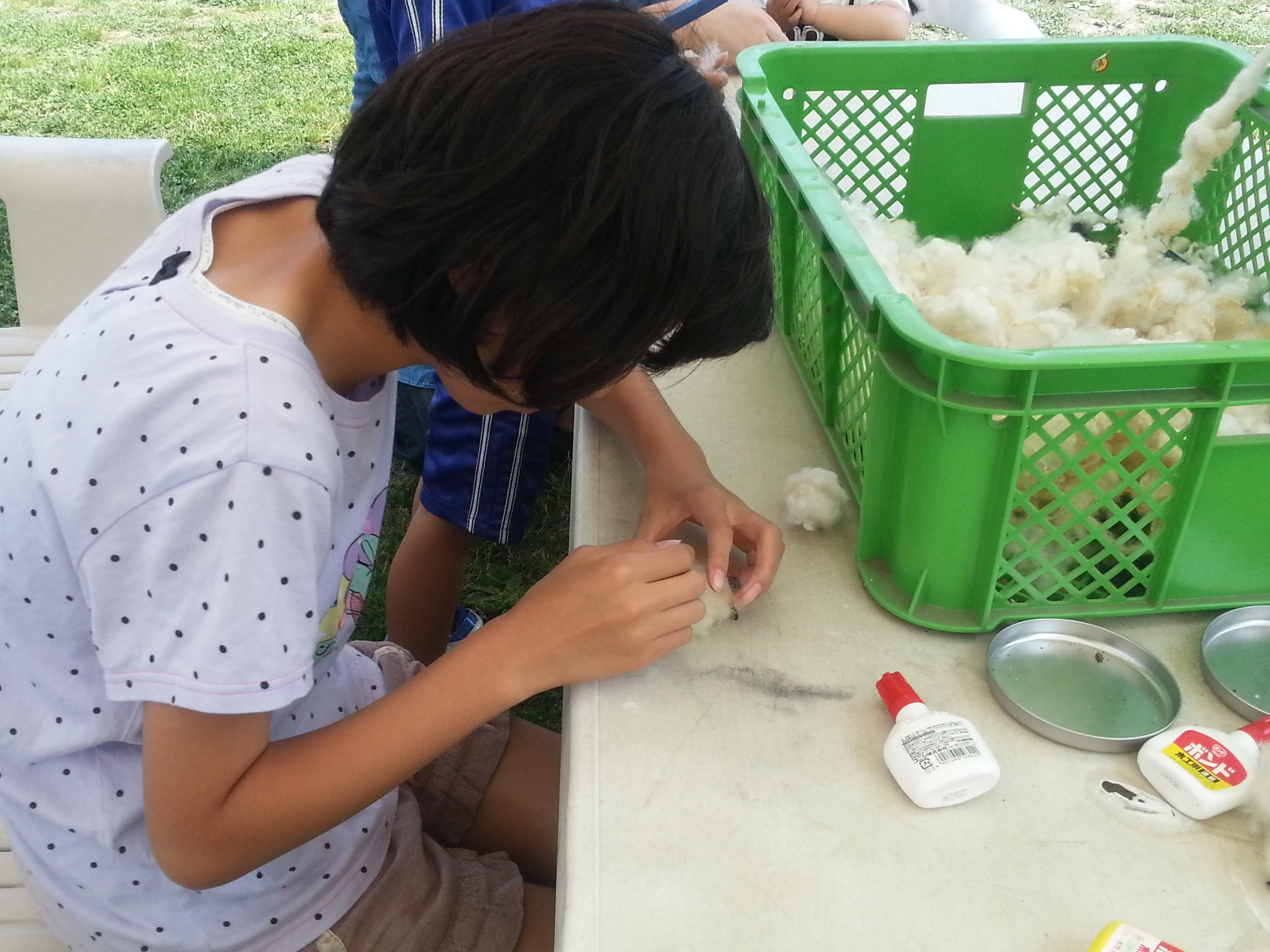 天然ウールのもふもふのひつじさんをみんなさん一生懸命に作成中。