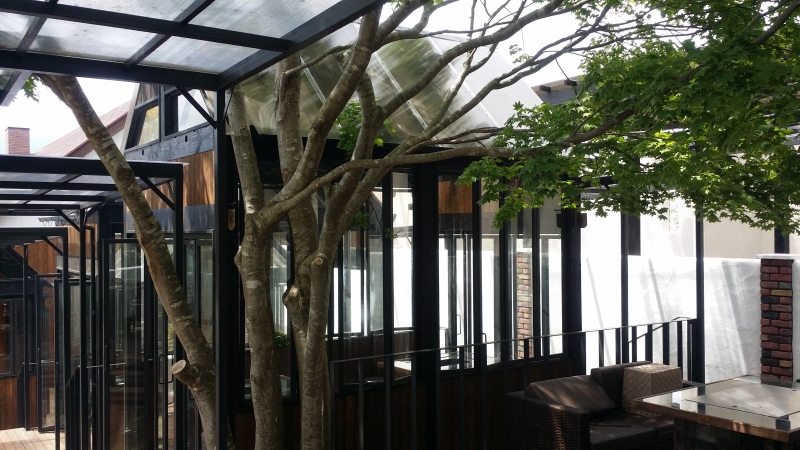 硝子のテーブル 白壁に真ん中にはシンボルツリーの楓 といったつくりになっております。