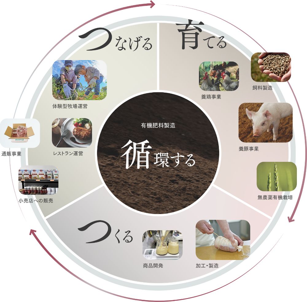 In order to pursue high quality and safety, we are ahead of the times in building an integrated system of “cultivating, producing, and connecting”. In addition, through recycling-oriented agriculture, we are also working to take responsibility for the future.