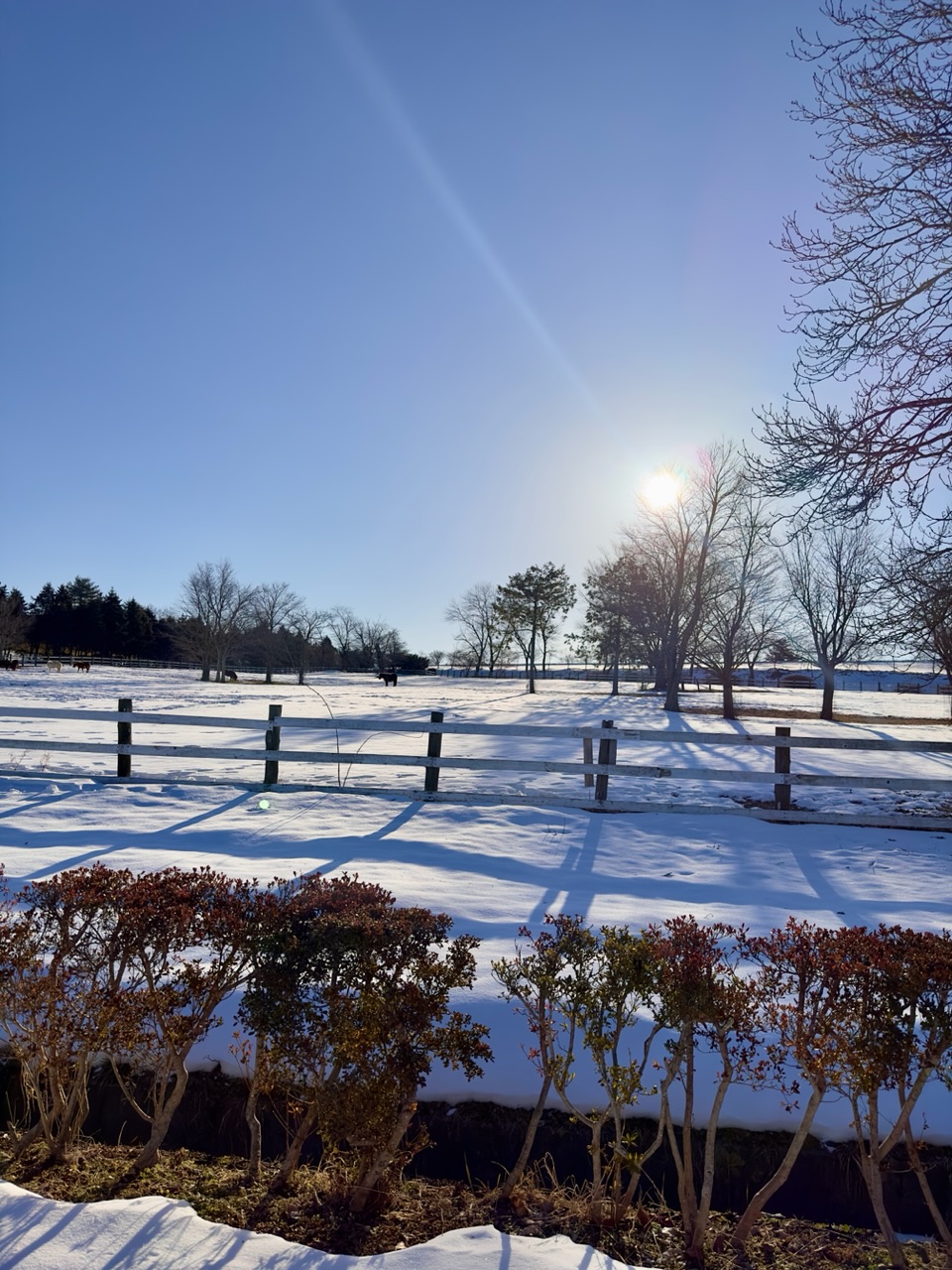 In the harsh cold of winter, the soft sunlight shining on the snow surface illuminates the ranch,