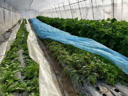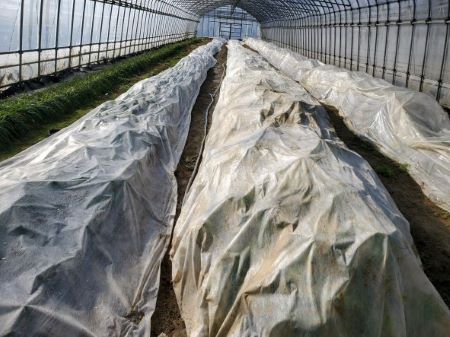 There is no facility such as a boiler that uses fuel in the vinyl house on the ranch, so the tunnel is covered with vinyl or cheesecloth to keep it warm and promote growth.