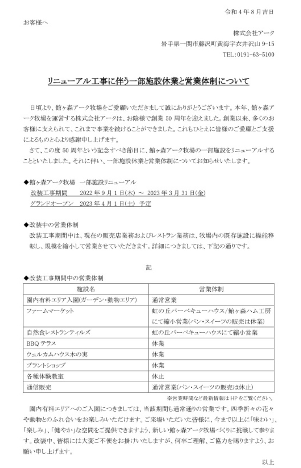 Thank you for using Tategamori Ark Ranch Restaurant "Tills" on a regular basis.