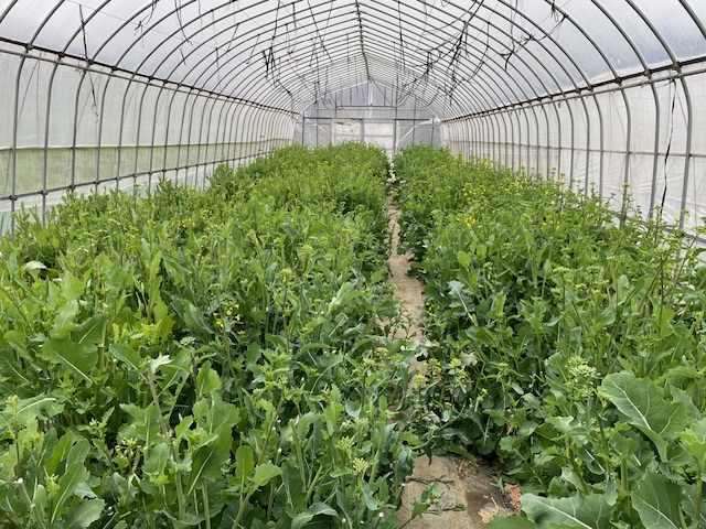 Inside the greenhouse, the daily harvest of budded greens, mizuna, chrysanthemum, and other crops is so rapid that it is impossible to keep up.