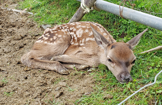 Newborn fawns lay down at the edge of the pasture near the fence to hide from predators.