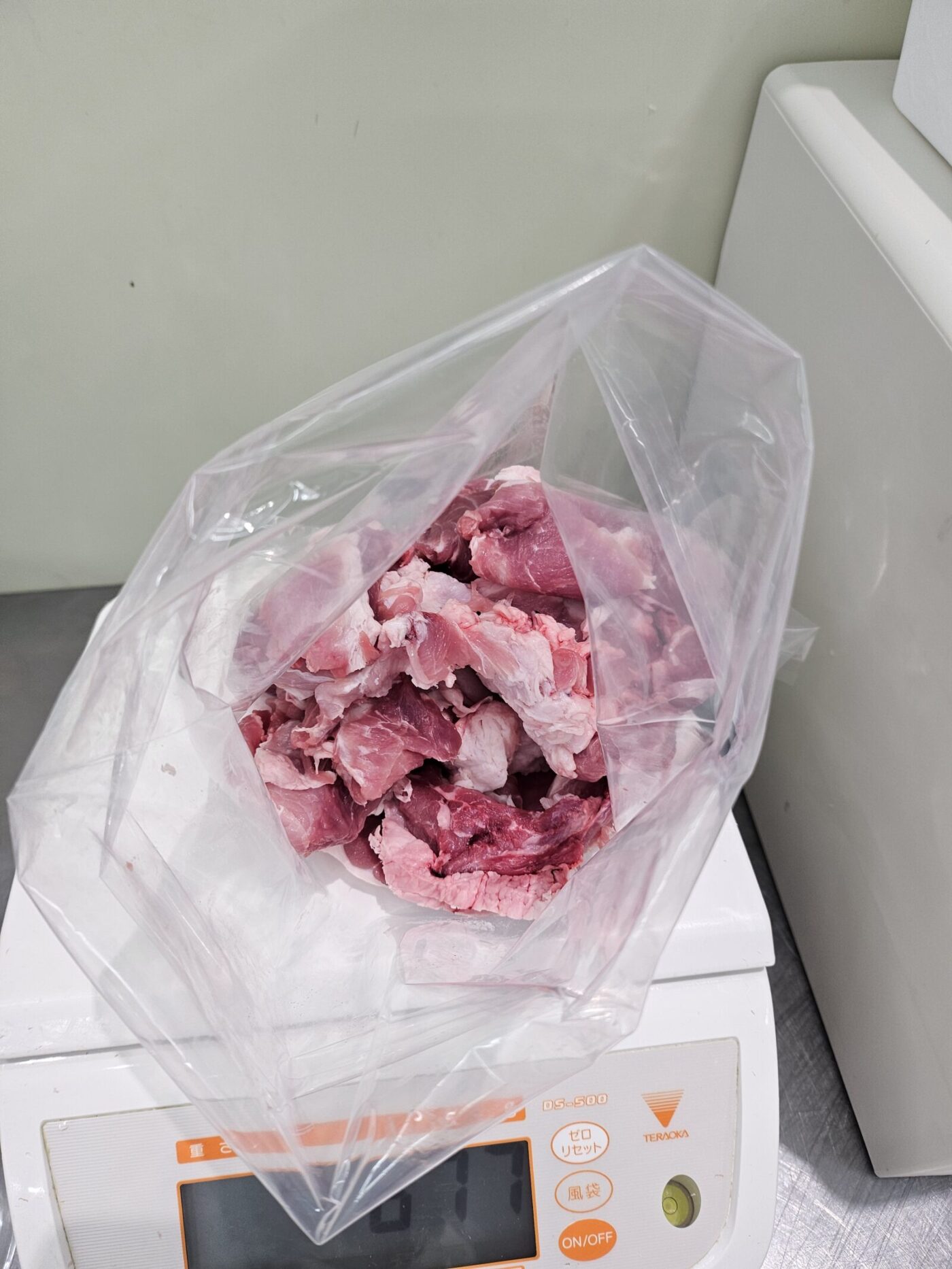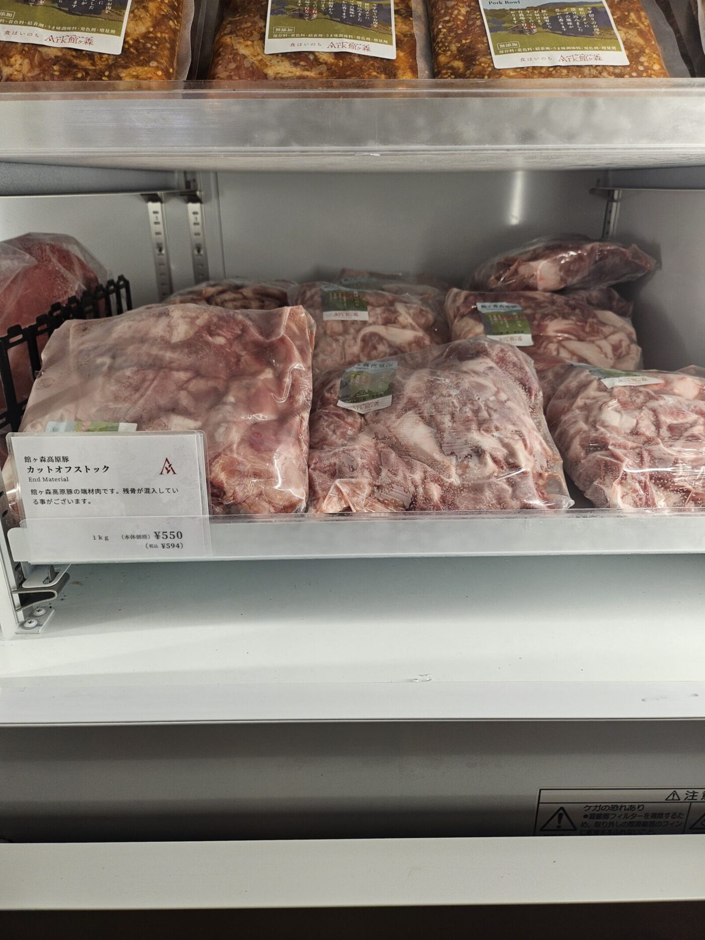 I would like to briefly explain the background of this product, Cut-Off Stock. Before cutting and selling Tategamori Highland Pork, we carry out a shaping process, which basically involves arranging the meat into a neat shape. During this process, we inevitably end up with leftover meat, so our head butcher, Kamoda, wondered if there was some way to utilize this, and started commercializing it three years ago.