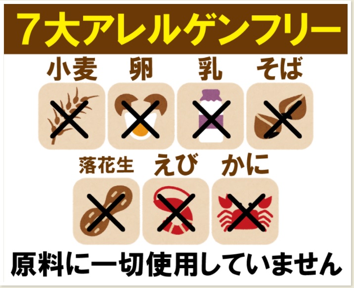 No flour or eggs, free of 7 major allergens (wheat, eggs, milk, buckwheat, peanuts, shrimp, crab).