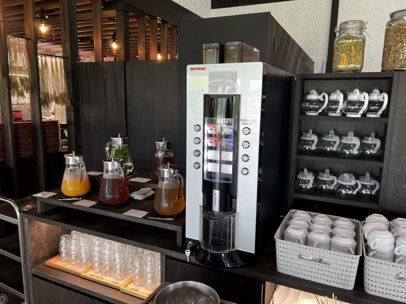 The restaurant offers herbal tea, coffee, orange juice, black tea, and more.