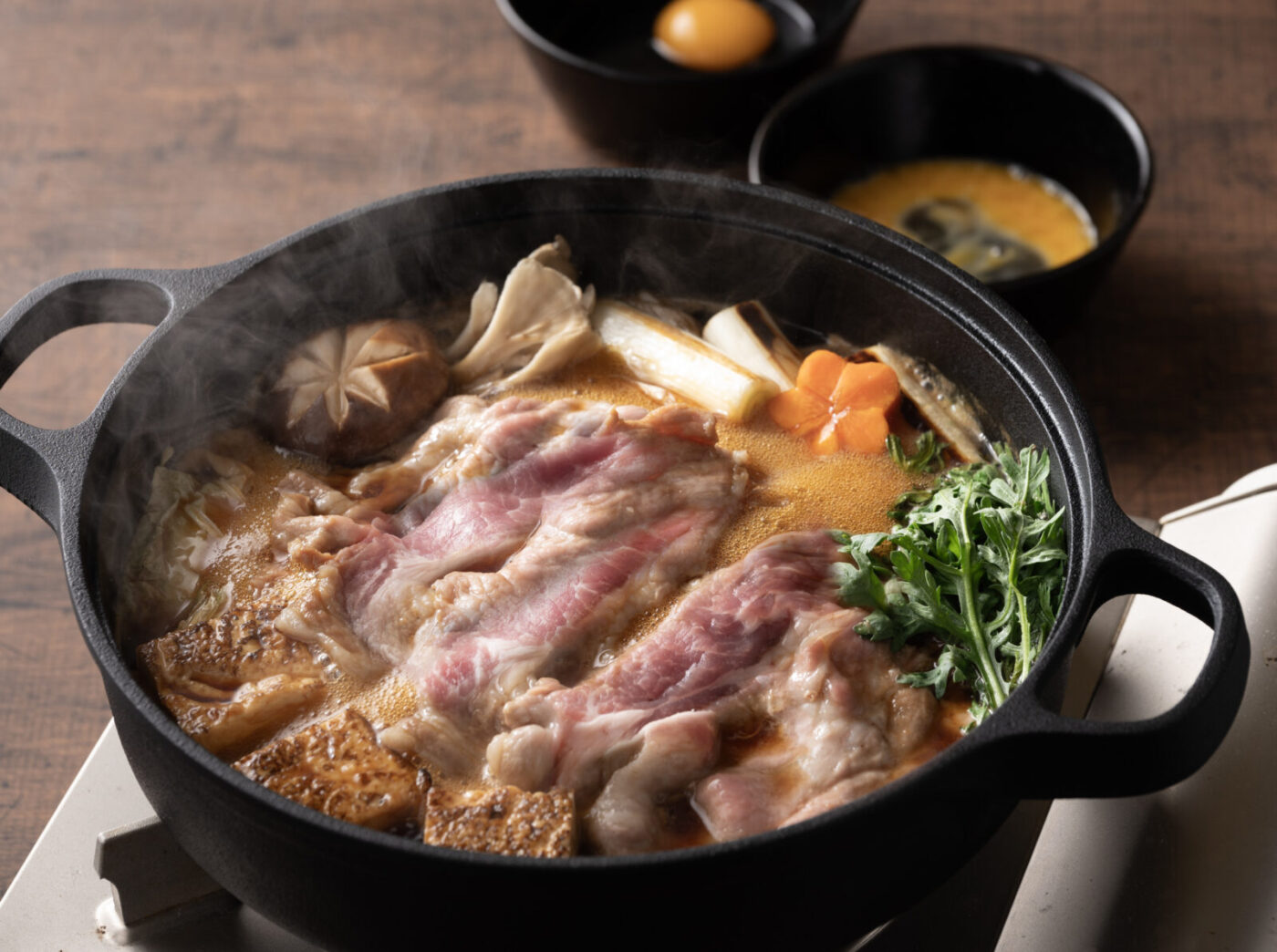 I love mushrooms, so I enjoy a quick hot pot using Tategamori Highland pork, lots of mushrooms, and whatever else I have in the fridge. The hot pot broth is delicious with just bonito stock, salt, and sesame oil. The flavors of the pork and mushrooms slowly seep into the soup, creating an exquisite soup with layers of deliciousness.