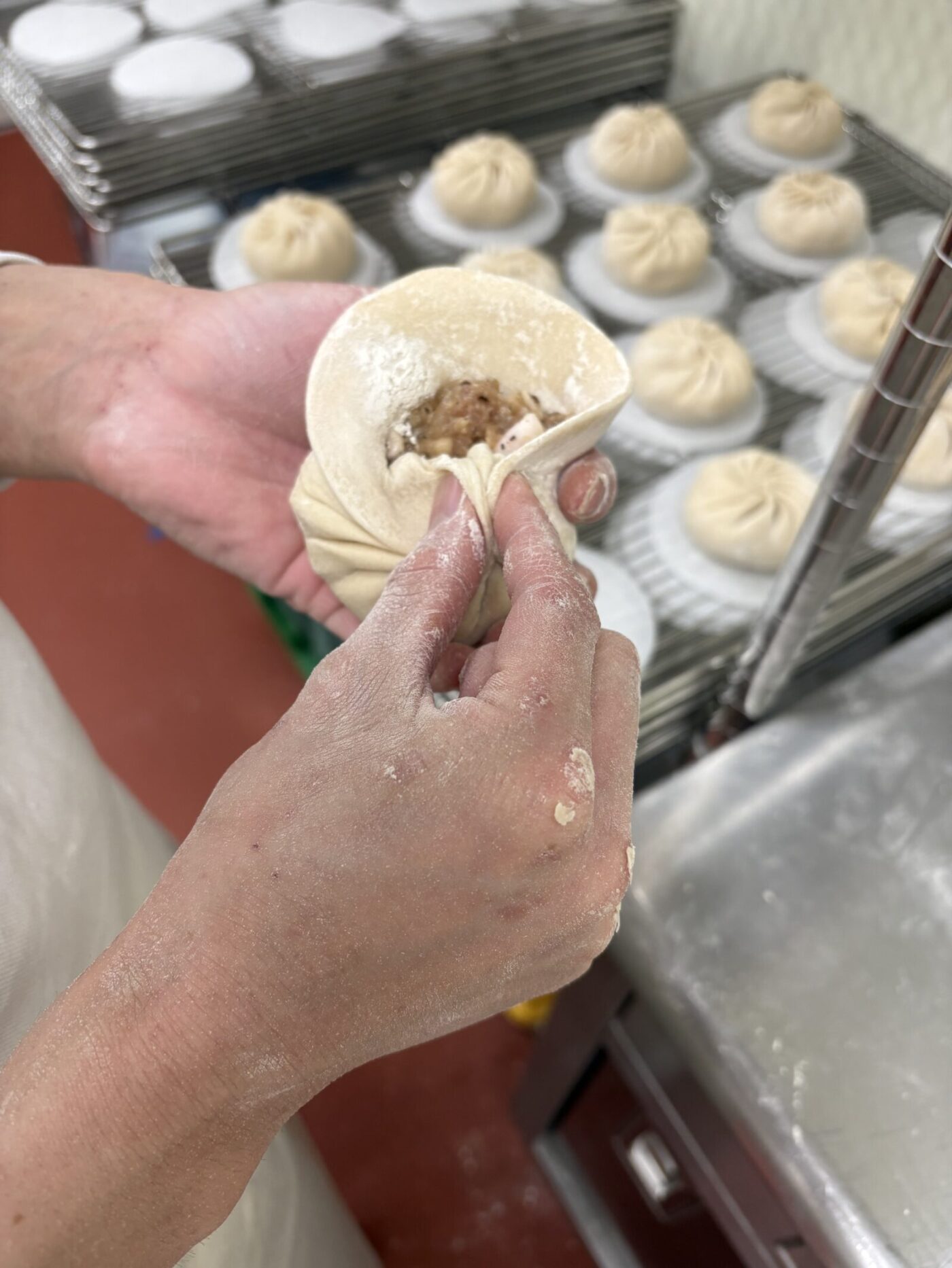 包み終わったら、ホイロに入れて発酵させたあと、蒸し器に入れます。
