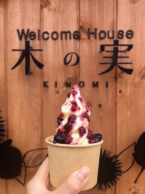 Vanilla soft serve topped with sauce made from blueberries grown at Tategamori Ark Farm.
