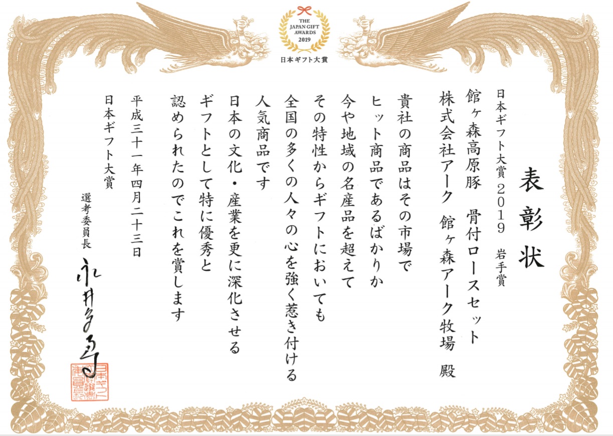 Our ``Tategamori Kogen Pork Bone Loin Set'' has won the Japan Gift Award.