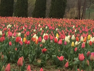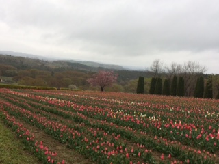The tulips are in full bloom at Niji no Oka Garden at 7am this morning.