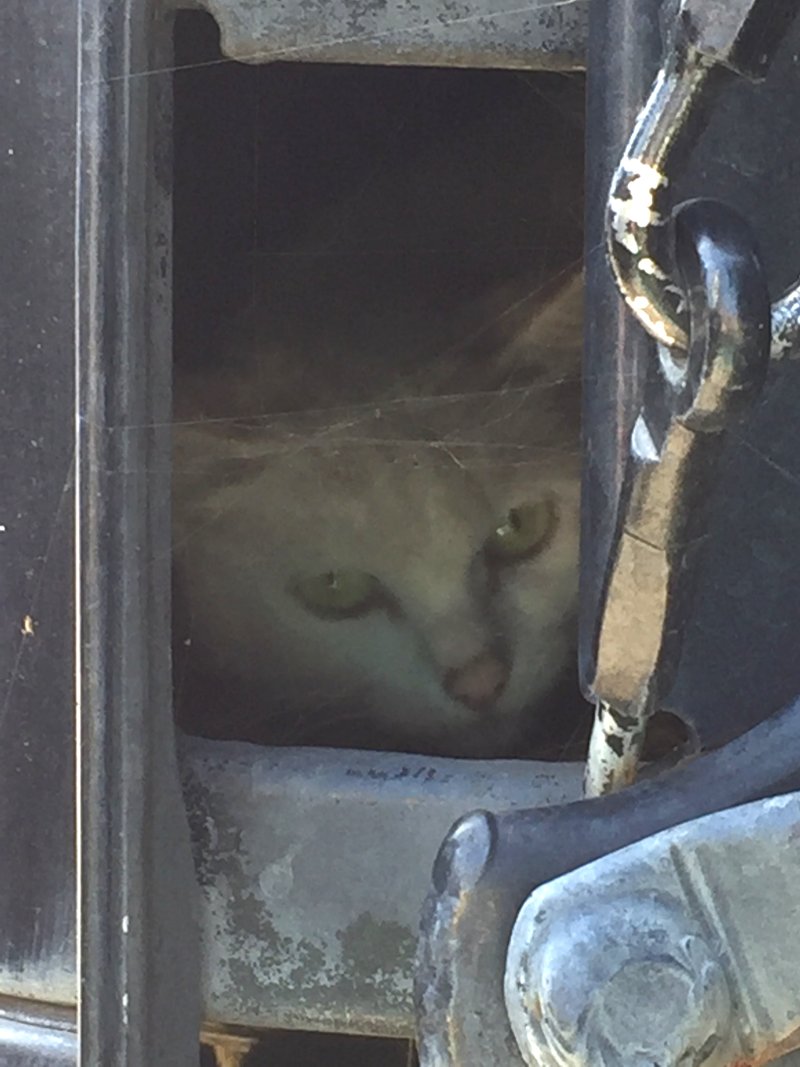 A white cat gave birth to two kittens under the cabin of a 4-ton dump truck.
