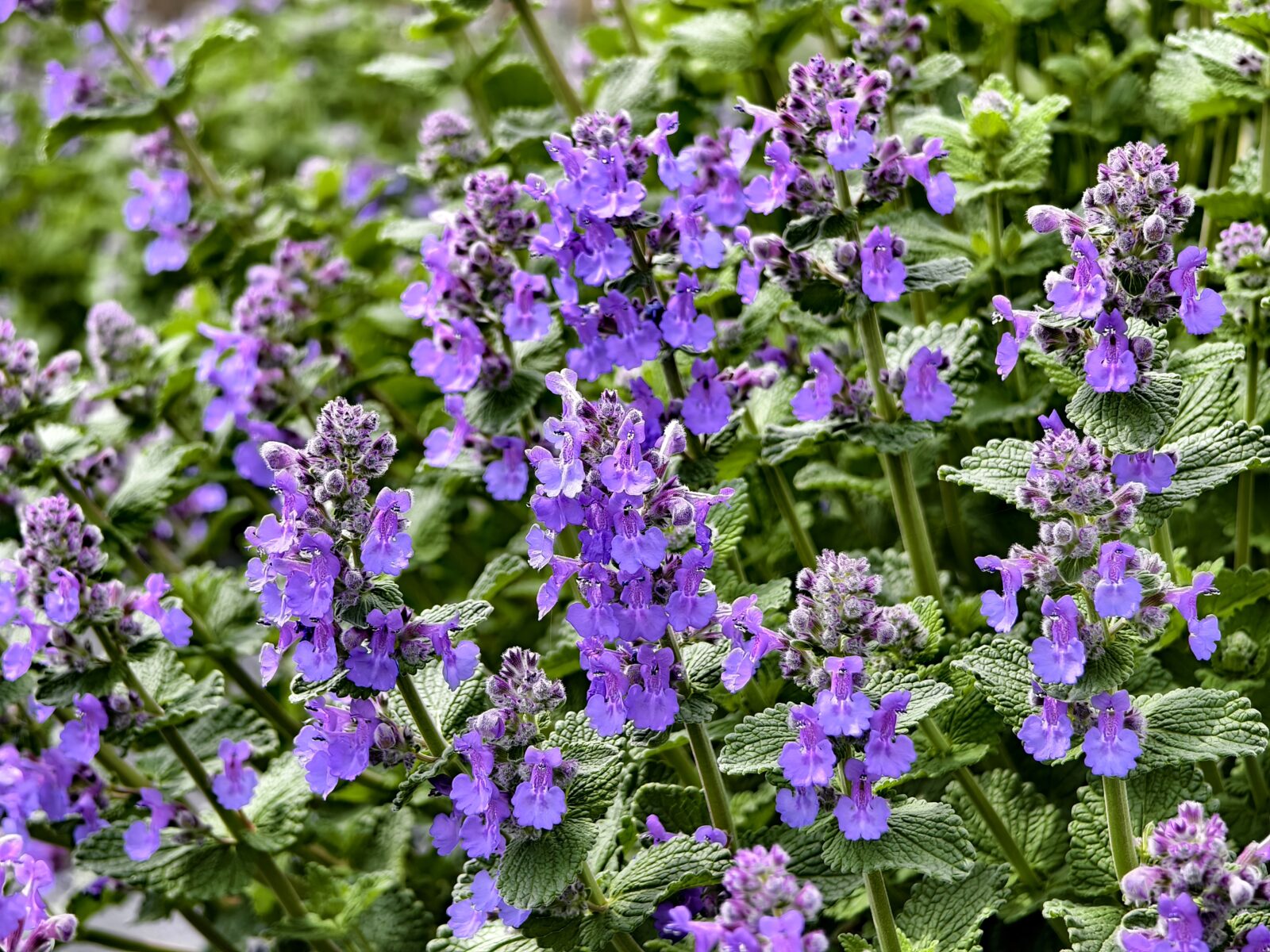 In the approximately 2 hectare lavender field, 4,500 lavender plants (grosso, flowering season: early July to late July) are planted, along with 1,800 catmint plants (early May to late June, early August to late October), which are a nectar source and have a long flowering season, 1,200 lemon balm plants (mid-June to late July), and 1,200 anise hyssop plants (early July to late August), allowing you to enjoy herbs for a longer period of time. (The photo shows catmint blooming in a lavender field.)