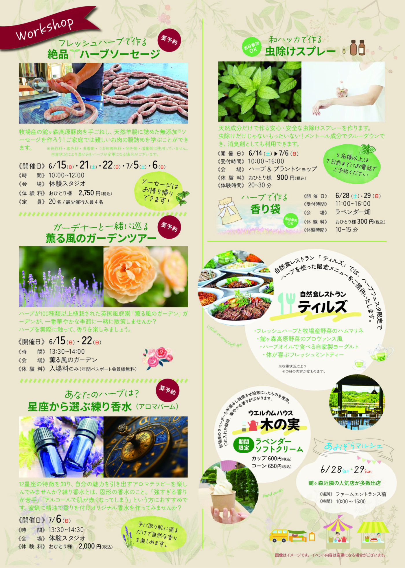 当日参加OKのワークショップ〇和ハッカで作る「虫よけスプレー」 ハーブ&プラントショップで期間中毎日開催 〇ハーブで作る「香り袋」 ラベンダー畑特設テント内で6/28(土)6/29(日)のみ開催