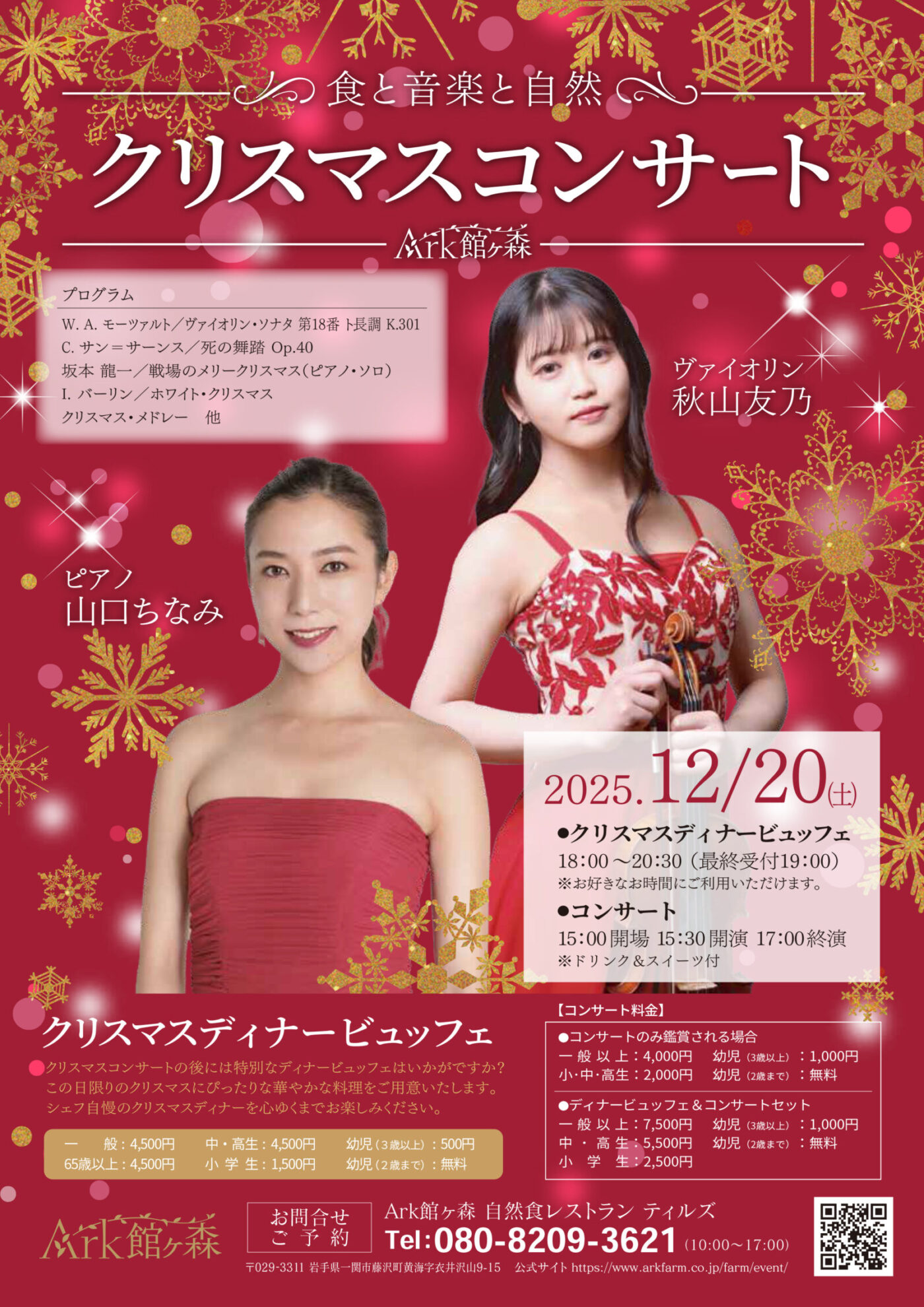 「クリスマス スペシャル ナイトビュッフェ」と「クリスマスコンサート」がセットでお得にお楽しみいただけます。下記お申込みフォームで「ナイトビュッフェセット希望」と「ご人数」をご記入ください。