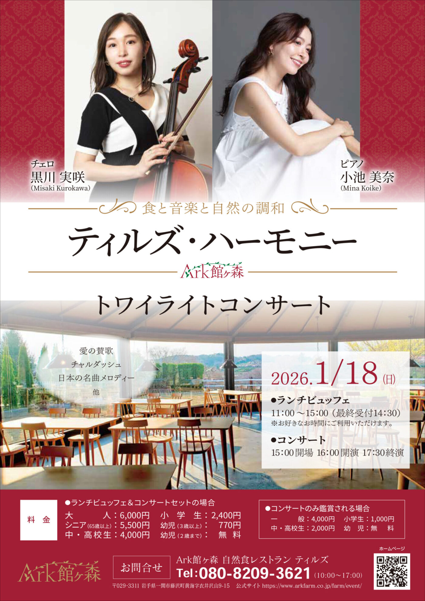 プログラムは「愛の賛歌」「チャルダッシュ」、そして日本の名曲メロディーなど、世代を問わず親しみやすく、それでいて本格的な名曲揃い。大きな窓の向こうに広がる館ヶ森の自然とともに、音楽が静かに溶け合う、特別な時間をお楽しみください。