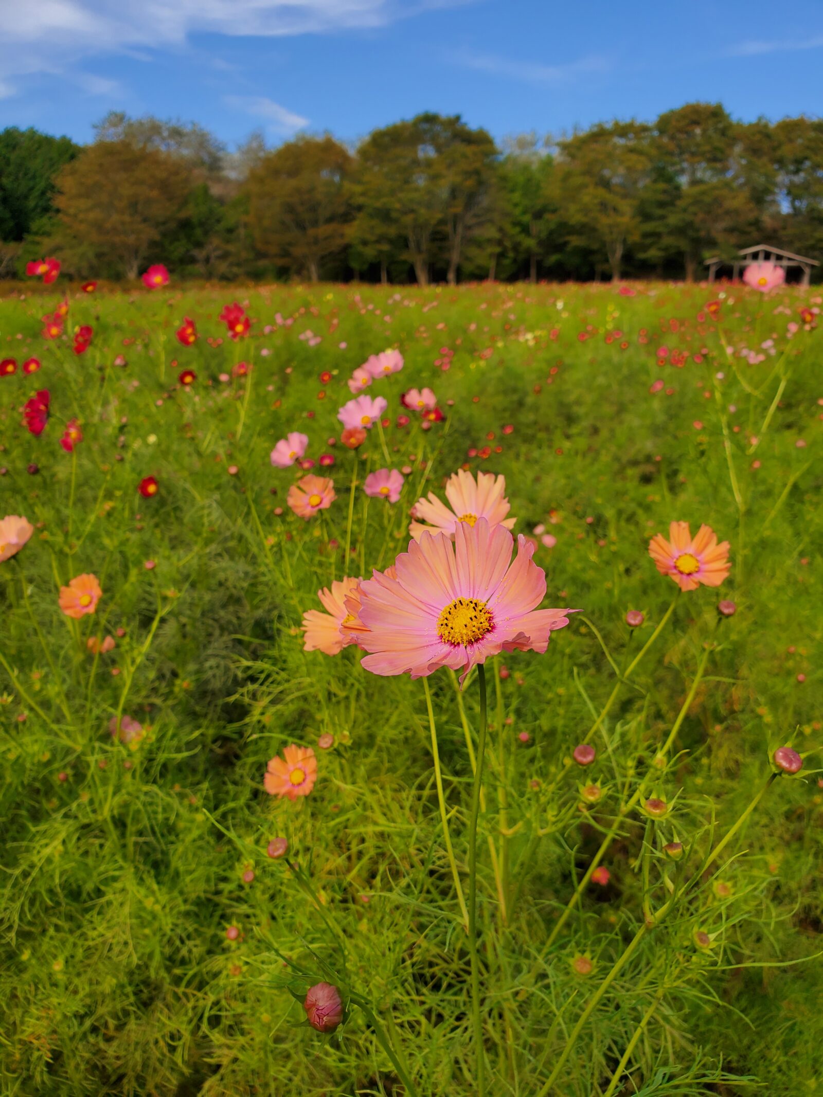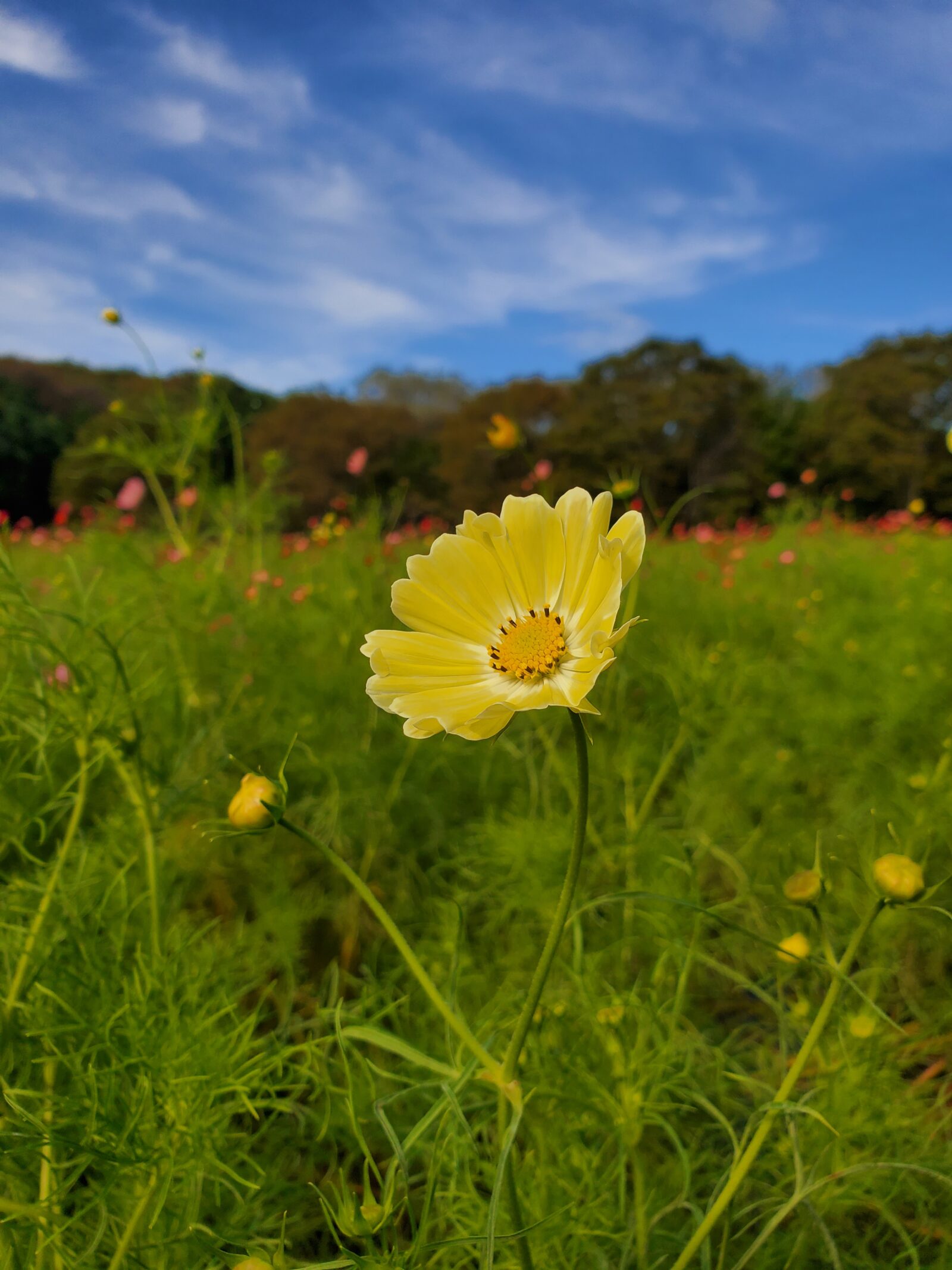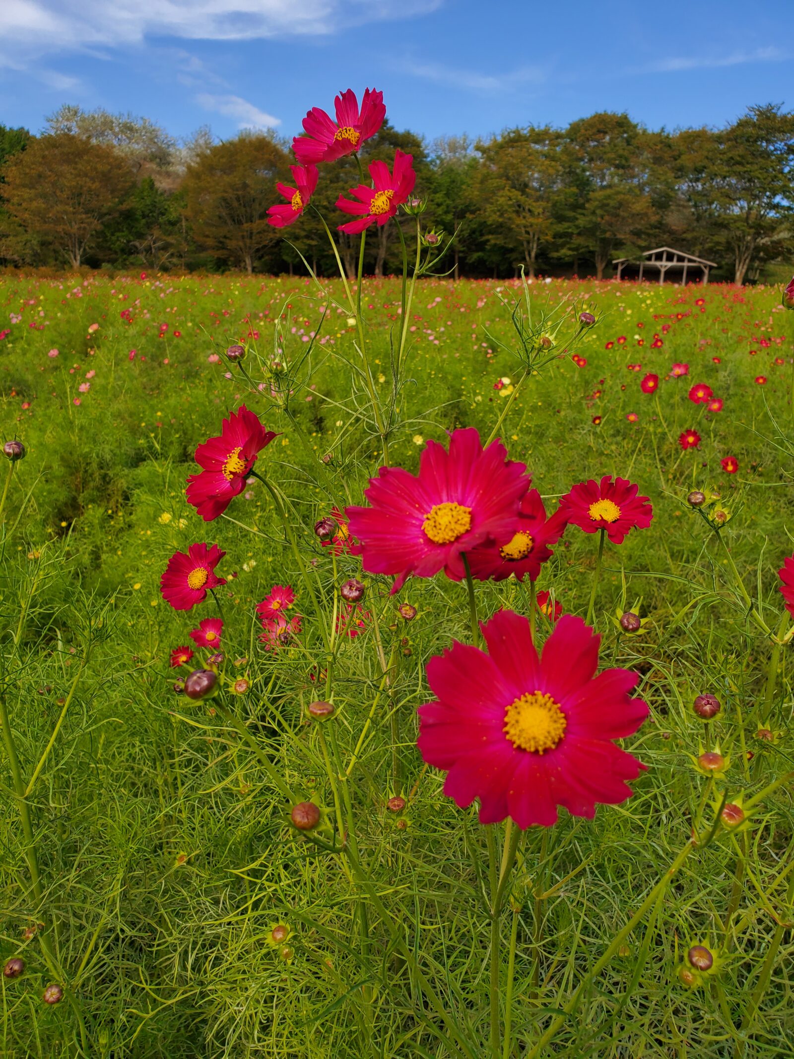 切り花向けに改良された秋咲きコスモスの代表品種キャンパスで、花径は6~7㎝と少し小ぶりですが、めずらしい花色のイエロー・オレンジ・クリムソンの3色のコスモスが咲いています。 寒くなってきましたが、まだ奇麗に開花中。
