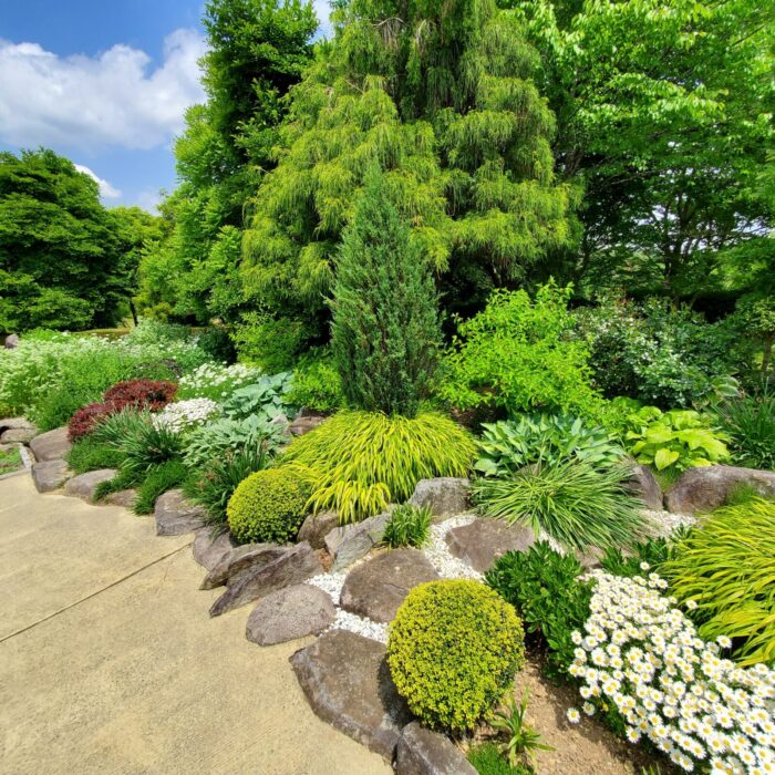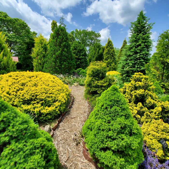 スギやヒバなどの常緑性の針葉樹のお庭。