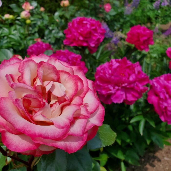 70種類の白・黄色・ピンク・赤いバラが6月から秋まで楽しめます。