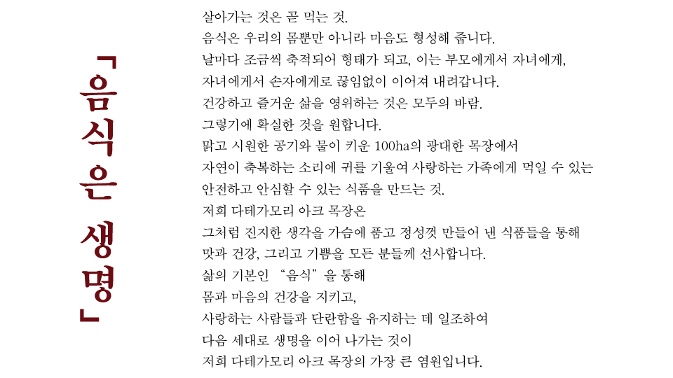 “나의 사랑하는 가족에게 안심하고 먹일 수 있는 먹거리를 생산하자.그렇게 하면 우리가 만든 것을 고객에게도 자신 있게 제공할 수 있을 테니까.”왜냐하면 “먹는” 일은 비단 우리 세대만의 문제가 아니라 다음 세대의 건강과 생명을 증진시키는 일과도 직결되기 때문입니다.고객의 식탁을 웃음 넘치는 건강한 식탁으로 만드는 산업, 그것이 저희의 농업니다.농업은 “건강 산업”입니다.