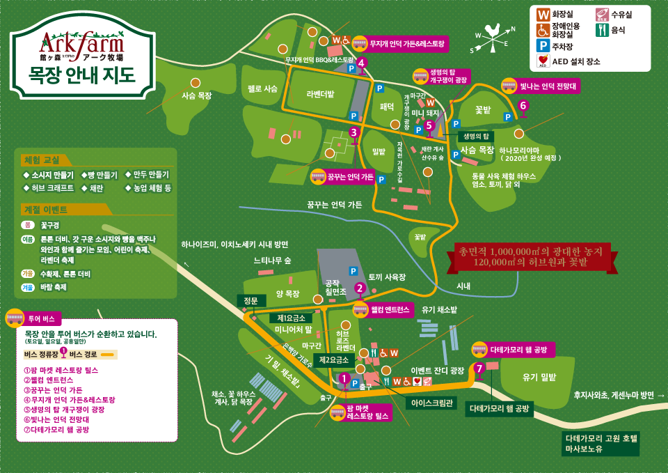 상쾌한 바람의 가든에서는 라벤더 가든, 로즈 가든, 허브 가든으로 이루어진 영국 정원을 느긋하게 산책할 수 있습니다.또한 웰컴 엔트런스에 자리 잡은 “트리 하우스”는 수령 100여 년에 이르는 느티나무를 호스트 트리로 하여 지어져 있습니다.트리 하우스의 명칭인 “구쿠노치”는 일본서기에 등장하는 나무의 신에서 유래.트리 하우스 위에서 바라보는 멋진 목장의 전경을 감상해 보세요.