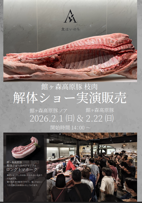 2026年2月1日(日)に「館ヶ森高原豚 ノア」の枝肉解体ショー&即売会を開催いたします。